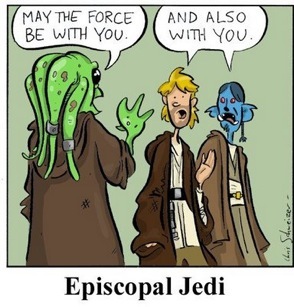 One of the first things I picked up from the Episcopal Church was saying “The Lord be with you,” a call-and-response practice mostly unknown to the evangelical communities within which I grew up. I love this salutation and have come to appreciate all of its variations. Although most Episcopalians respond to the “Lord be with you” by saying “And also with you,” here, of course, we respond by saying “And with thy spirit,” which is also what most Roman Catholics are saying now with their new Roman Missal. At the church where I was confirmed in Pasadena (All Saints Pasadena), we would say “God dwells within you” and then respond “and also within you,” as a kind of Episcopal “Namaste” (which in Sanskrit means “the divinity within me bows to the divinity within you.”). And I have heard that you can identify a Jedi as Episcopalian if they respond to the phrase “May the Force be with You” by saying “And also with you.”
