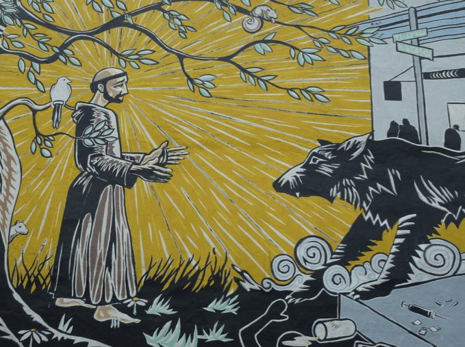 If we can see beyond the medieval preoccupation with blood, we can see that the stigmata was a powerful expression of St. Francis’ empathy for Christ and for all who suffer. Francis was able to share in the sufferings of the poor and the lepers, but he didn’t stop with humans. He shared the sufferings of animals and they responded to him, they listened to him. When a ferocious wolf was terrorizing the city of Gubbio, St. Francis saw beyond the wolf’s violence and into its hurt and hunger and neglect. The wolf felt the saint’s empathy so deeply that it became as gentle as a lamb in his presence and even made a pact with its paw to never terrorize Gubbio again. The empathy of St. Francis even extended to the sun, the moon, the stars, the wind, the water and all of creation, which were all brothers and sisters to him.