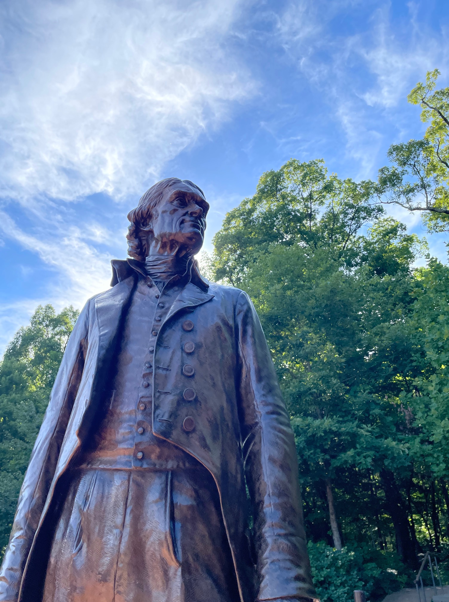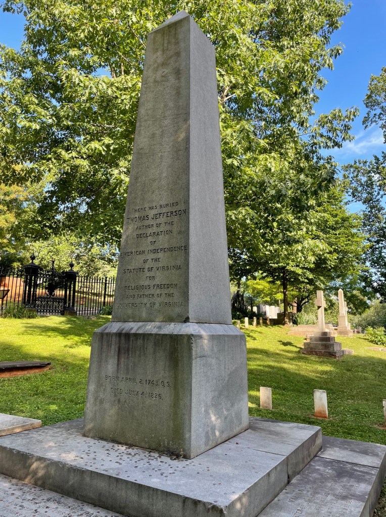 I saw this same tension in the life of Thomas Jefferson; and I appreciated how the museums and guides at Monticello refused to turn a blind eye to the glaring contradiction in the life of this founding father. Thomas Jefferson owned over 600 slaves throughout his life, he had an enslaved concubine in Sally Heming with whom he fathered several children, and he benefitted enormously from the institution of slavery, which he himself criticized as oppressive. He criticized slavery because it clearly contradicted those truths that he held as self-evident in those words that might be considered the most influential words written over the last 300 years: “We hold these truths to be self-evident that all men are created equal; that they are endowed by their Creator with certain unalienable Rights, that among these are life, liberty and the pursuit of happiness.” His words have proven to be far more powerful and far-reaching and consequential than even he could have imagined. The musical Hamilton speaks to this when a character says, “We hold these truths to be self-evident that all men are created equal / And when I meet Thomas Jefferson, I’m a compel him to include women in the sequel.” His core ideas of equality and liberty resonate deeply with our Christian values, values upon which our nation was founded, values that our flag symbolizes, and values that we celebrated last week on the 4th of July, a day that derives so much of its meaning from the wisdom and courage of Thomas Jefferson, who not only wrote the Declaration of Independence (which was officially adopted on the 4th of July in 1776) and who not only doubled the size of the country with the Louisiana Purchase in 1803, but who also died on the 4th of July in 1826, exactly fifty years after our nation declared independence. I visited his grave and learned there that he insisted on being buried underneath a great oak tree, which he had admired as a young child.