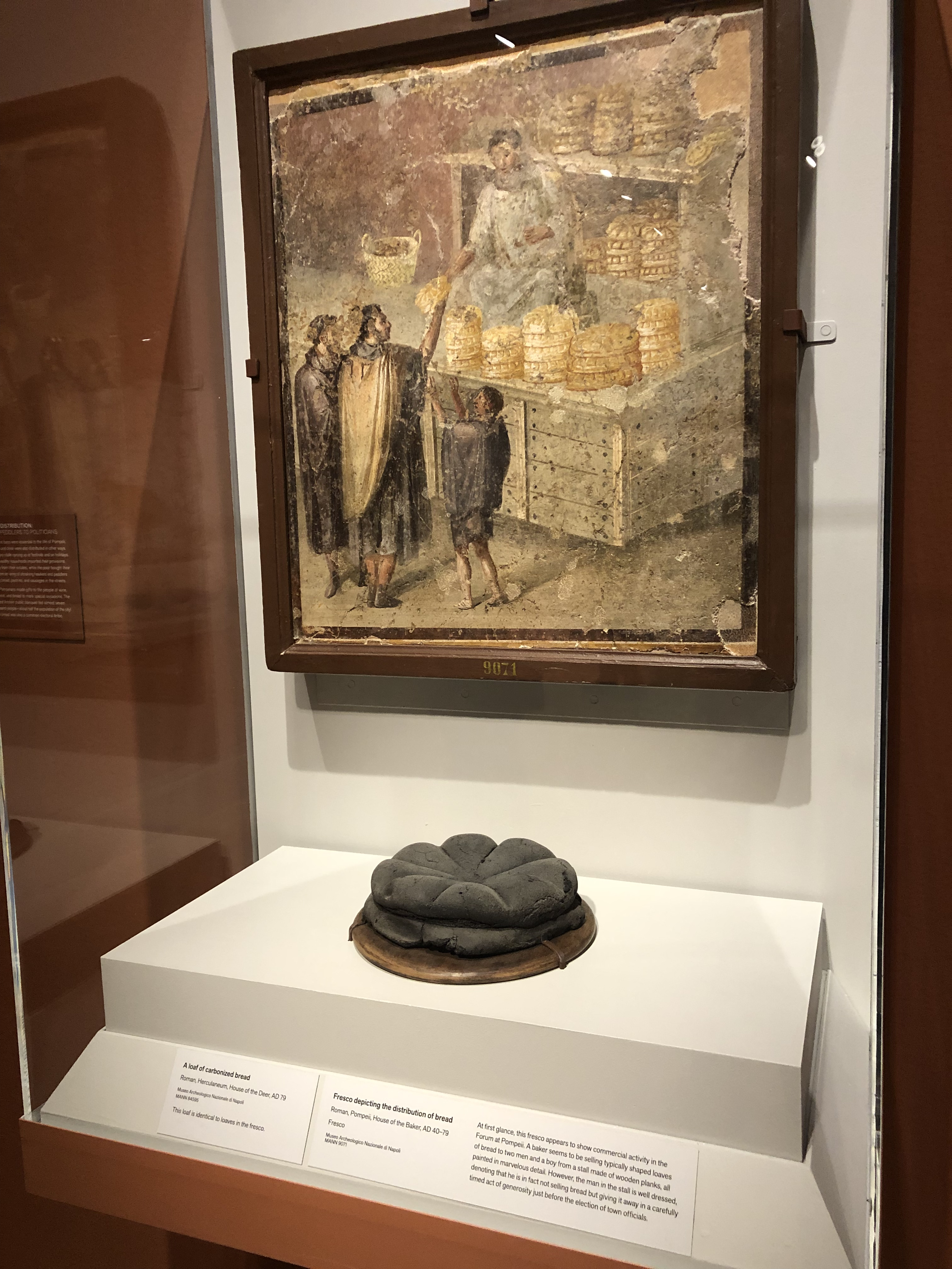 [2] Fresco depicting the distribution of bread. Roman, Pompeii. House of the Baker. AD 40 – 79. Fresco. MANN 9071. “At first glance, this fresco appears to show commercial activity in the Forum at Pompeii. A baker seems to be selling typically shaped loaves of bread to two men and a boy from a stall made of wooden planks, all painted in marvelous detail. However, the man in the stall is well dressed, denoting that he is in fact not selling bread but giving it away in a carefully timed act of generosity just before the election of town officials.” Legion of Honor Museum, San Francisco CA. “Last Supper in Pompeii: From the Table to the Grave” May 7, 2021 – August 29, 2021. Date of Visit: June 4.