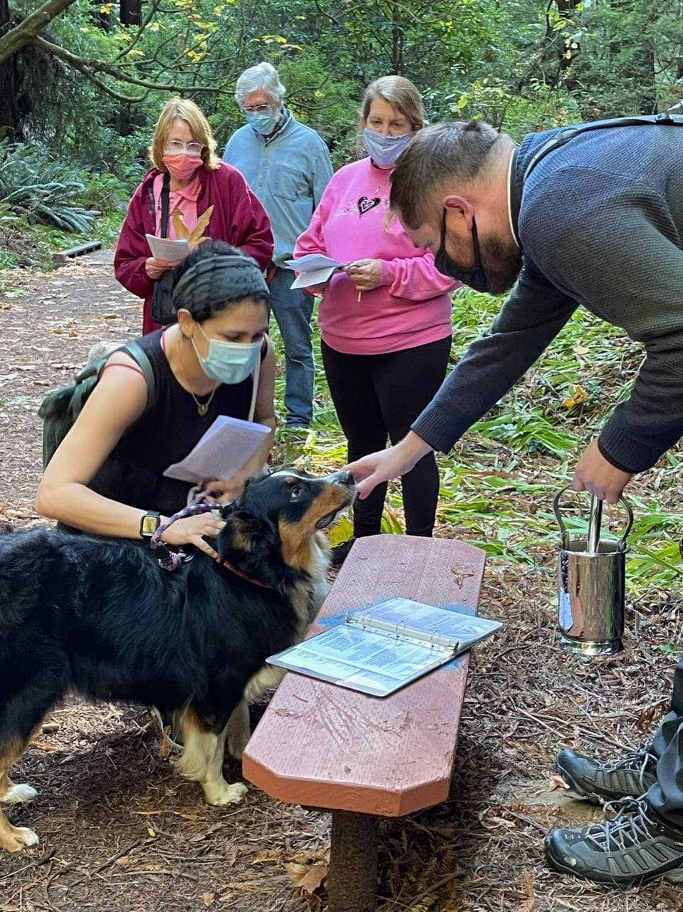 The first portrait I studied was that of St. Nathaniel son of Tolmai (also known as St. Bartholomew, whose symbol is a flaying knife), who is portrayed in Fr. Shag’s painting as holding a book under a fig tree, where (according to the Gospel of John) he supposedly had a mystical experience with God. This last year, I believe Nathaniel along with the prophet Amos (who was a fig tree farmer) have helped us uphold our primary core value (worship), especially during the first half of the year when we were not gathering in-person under this roof. Instead, we worshipped together in person by going out among the trees (like Nathaniel). We worshipped at Deacon Anne’s redwood-studded home during Holy Week and Eastertide; and this year, we finally returned to Sequoia Park for our Sacred Saunters during the summer and on the feast day of St. Francis. And in the Fall, a few of us gathered at David Lochtie’s home for a house blessing and Sacred Saunter around his “Tree of Forgiveness” and spiral labyrinth. When I returned from visiting family back East in the summer, I preached about the trees of Monticello; and how, according to Choctaw elder and Episcopal Bishop Steven Charleston, the wind in the trees whisper our name. And the Sunday after I preached about trees, we finally re-opened this building after sixteen months and after an enormous amount of preparation and renovation to increase ventilation. Our Regathering Task Force spent hours prayerfully creating a realistic plan based on guidelines from the diocese and county and state (that continue to change) to bring us all safely back into this beautiful building made of old growth redwood trees that were alive when Jesus walked the earth and when Nathaniel had his mystical encounter under his fig tree. What a joy it’s been for us to be back in this sacred space made of ancient trees that protect us and keep us warm and inspire us to worship.