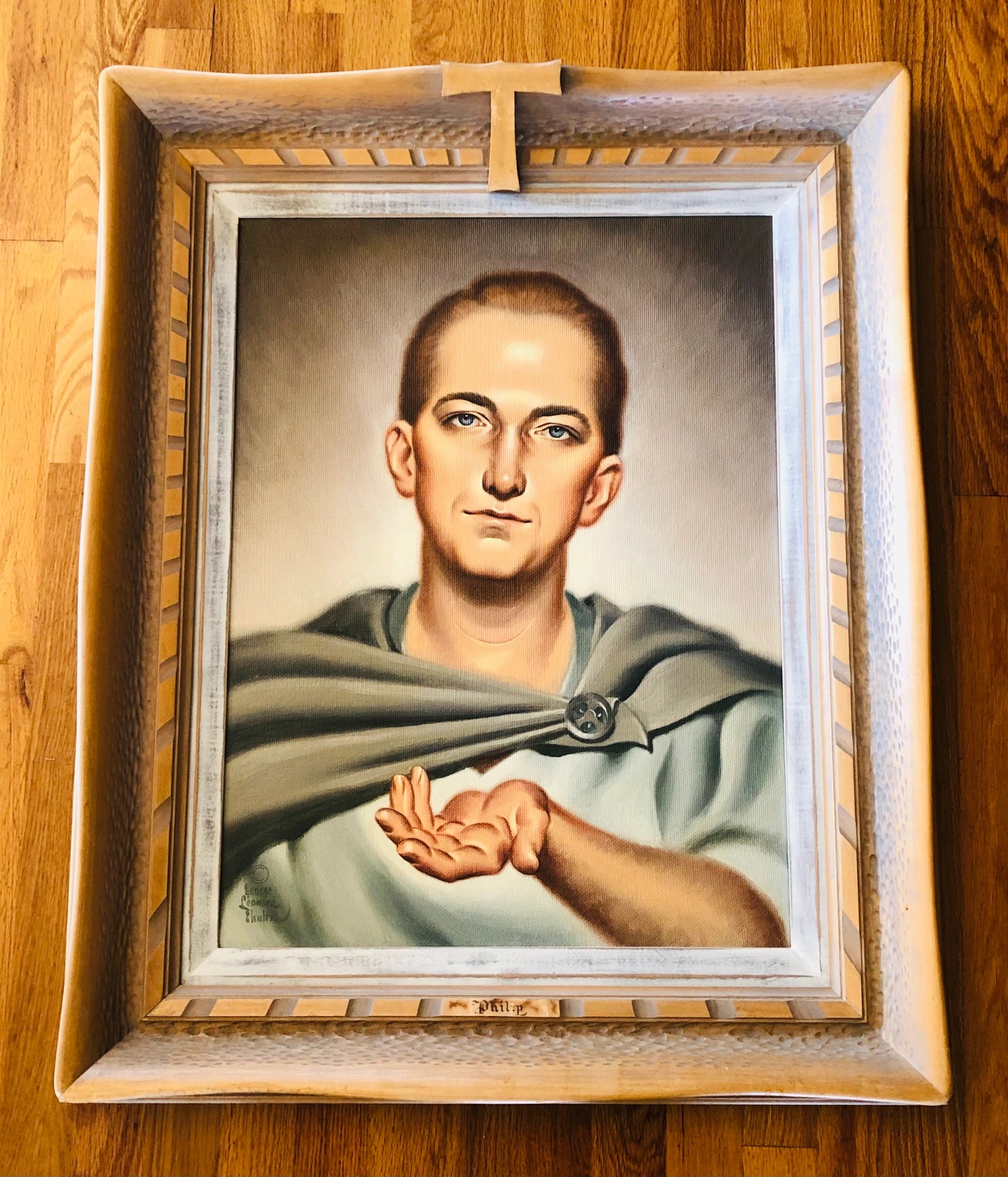 A Methodist pastor spent decades searching for some artwork that had been spiritually formative for her as a child growing up in Tahlequah Oklahoma. Every couple years, she would do a Google search for this artwork, but never found any leads until last weekend when her search led her to Christ Church Eureka. Now our church is already a pilgrimage destination for organ aficionados, thanks to our magnificent Kegg Pipe Organ. It’s also a destination because of our unique prayer labyrinth and Stations of the Cross in our chapel and, of course, our historic redwood sanctuary, adorned with icons and stained-glass windows and 150-year-old pews, which at one time, had a seat reserved for former Humboldt resident and President Ulysses S. Grant. Our church is a destination for many reasons, but for this Methodist pastor, our church is now personally meaningful because of artwork that was installed here this last year, thanks to the generosity of beloved parishioner Annalee, and the vestry who voted to install the artwork here, and the wardens, John Patton and Royal McCarthy, who did the hard work of installing the art. I’m referring, of course, to the portraits of the Twelve Apostles that now adorn the walls of Lewis Hall, that were painted by Fr. George Leonard Shultz (grandfather of Annalee and Molly) and priest who served here in the 1960s when Fr. Jack Thompson was on vacation. (Fr. Jack wore this stole with symbols of apostles).