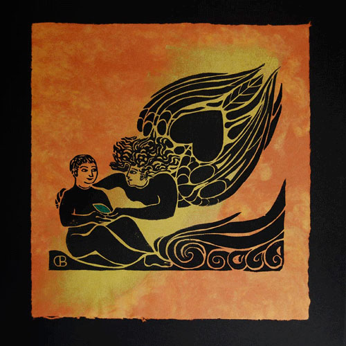 And that is a motif I notice throughout Connie’s art: the embrace of tender and almighty arms of love. You see this motif expressed on page 16 in her Wood Block Print “Benedicta Veritas II” and in a clay sculpture titled “Loss,” in which two people, who are grieving, lean into each other’s warm presence and embrace and receive comfort as a result. Connie knew the depths of grief and loss, including the tremendous grief of losing her son Grant; and Connie knew what it felt like to be held.