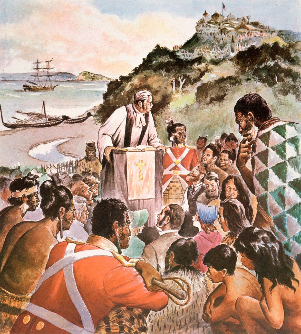 In 1809, an Anglican chaplain in Australia named Samuel Marsden met a young Māori sailor named Ruatara and, after meeting other Māori[2] at Parramatta in Australia, became convinced that they were “a very superior people in point of mental capacity.”[3] Marsden urged the Church Missionary Society (CMS) to establish a mission in New Zealand; and on Christmas Day in 1814, he led the first Christian service in Aotearoa, preaching to an assembled crowd while Ruatara translated. The Rev. Samuel Marsden later became known as the “Apostle to New Zealand.”