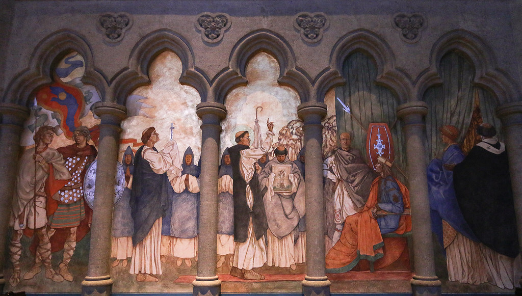 “As they drew near to the city, after their manner, with the holy cross, and the image of our sovereign Lord and King, Jesus Christ, they sang in concert this litany: ‘We beseech thee, Lord, for Thy great mercy, that Thy wrath and anger be turned away from this city, and from Thy holy house, for we have sinned. Hallelujah.’” I. XXV. https://ccel.org/ccel/bede/history/history.v.i.xxiv.html Bede describes “the image of our sovereign Lord and King, Jesus Christ,” but does not specify an image of Christ the Good Shepherd. In a mural portraying this event at Grace Cathedral in San Francisco, the image carried represents Christ as the Good Shepherd with the lamb on his shoulder. I must confess that I took some liberty in claiming that this was the image used 1500 years ago even though there is no strong evidence for this. The fact that the Good Shepherd image was so popular from 2nd to 4th century may support my assertion.