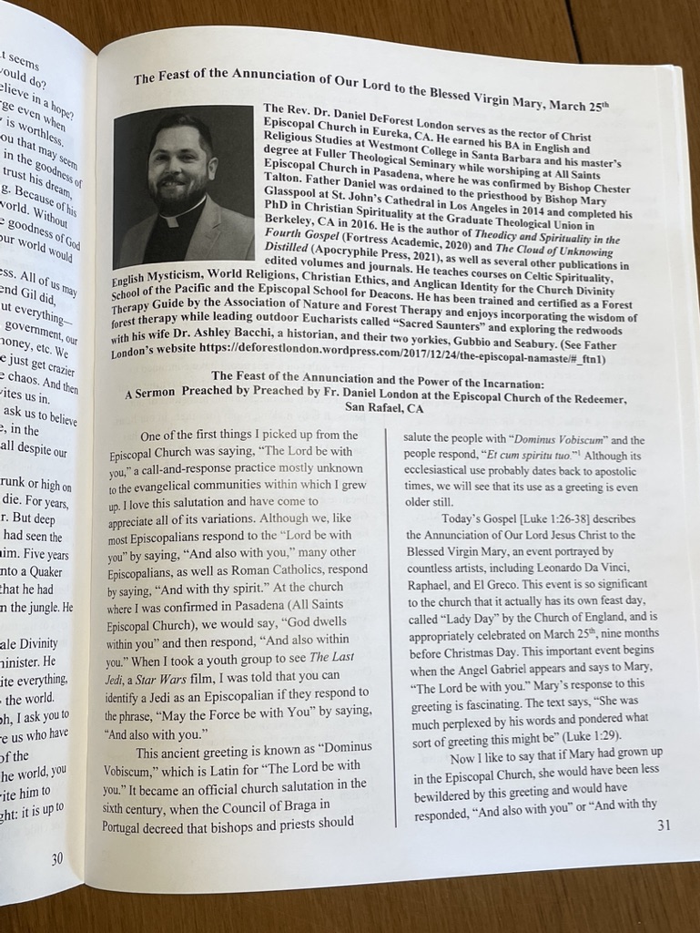 The Rev. Dr. Daniel DeForest London serves as the rector of Christ Episcopal Church in Eureka, CA. He earned his BA in English and Religious Studies at Westmont College in Santa Barbara and his master’s degree at Fuller Theological Seminary while worshiping at All Saints Episcopal Church in Pasadena, where he was confirmed by Bishop Chester Talton. Father Daniel was ordained to the priesthood by Bishop Mary Glasspool at St. John’s Cathedral in Los Angeles in 2014 and completed his PhD in Christian Spirituality at the Graduate Theological Union in Berkeley, CA in 2016. He is the author of Theodicy and Spirituality in the Fourth Gospel (Fortress Academic, 2020) and The Cloud of Unknowing Distilled (Apocryphile Press, 2021), as well as several other publications in edited volumes and journals. He teaches courses on Celtic Spirituality, English Mysticism, World Religions, Christian Ethics, and Anglican Identity for the Church Divinity School of the Pacific and the Episcopal School for Deacons. He has been trained and certified as a Forest Therapy Guide by the Association of Nature and Forest Therapy and enjoys incorporating the wisdom of forest therapy while leading outdoor Eucharists called “Sacred Saunters” and exploring the redwoods with his wife Dr. Ashley Bacchi, a historian, and their two Yorkies, Gubbio and Seabury.