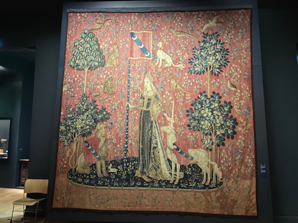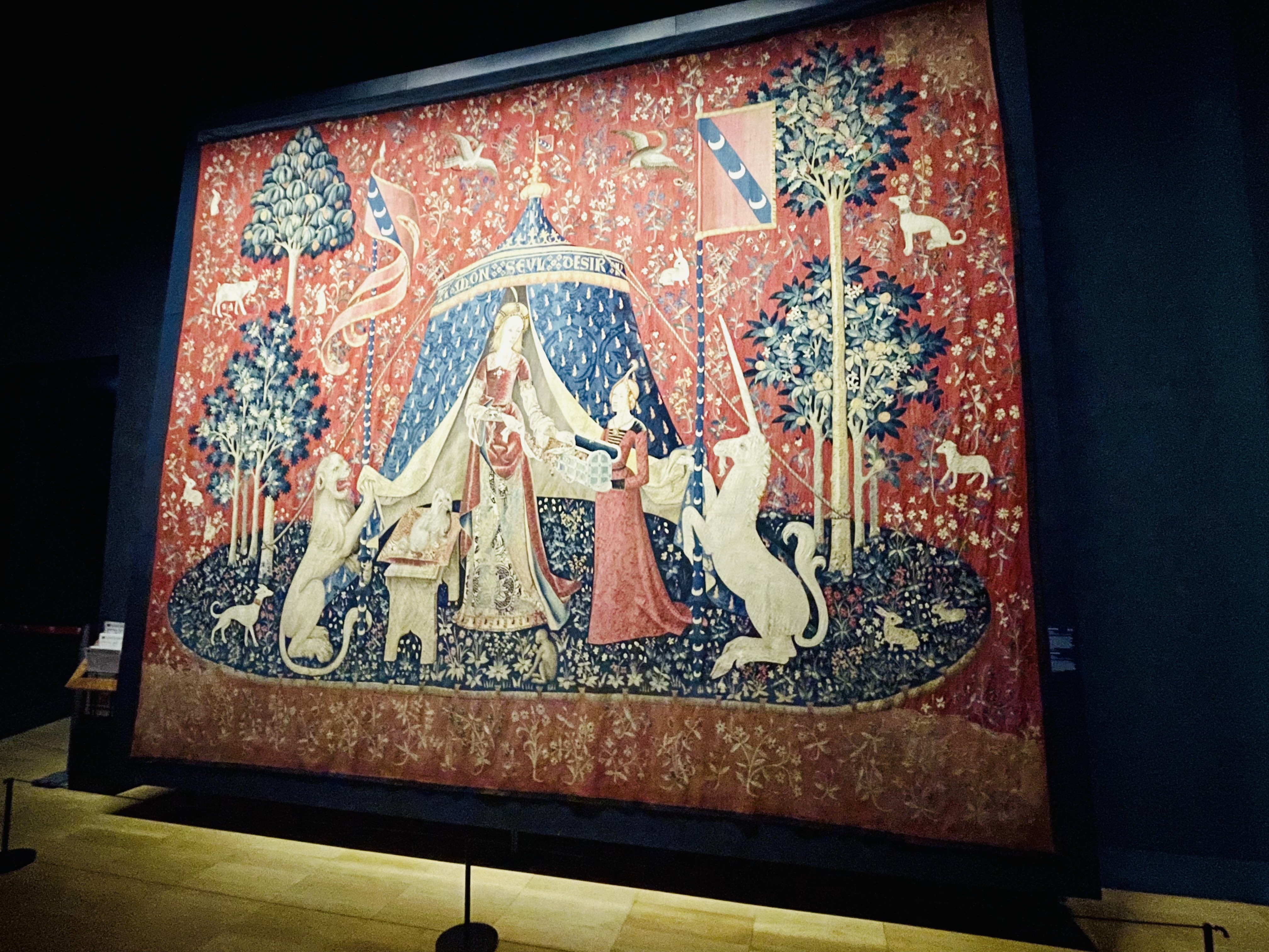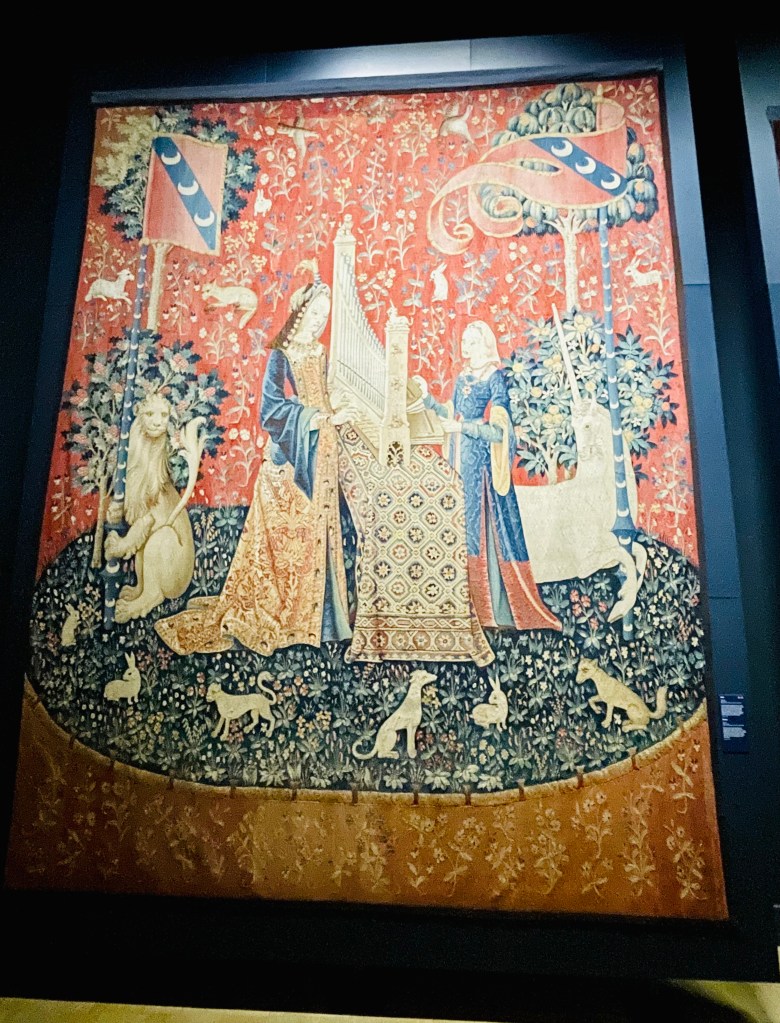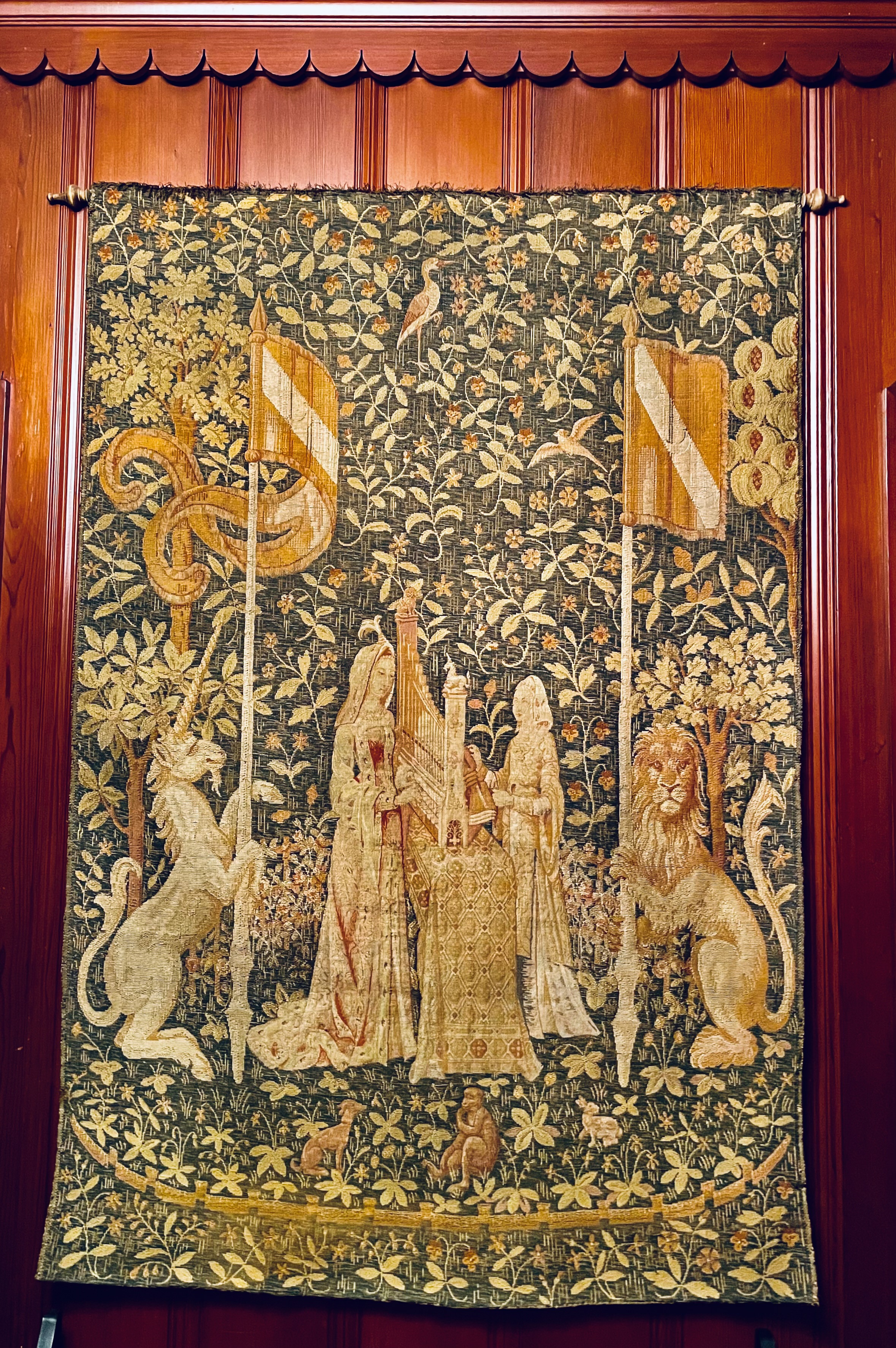 The Book of Glory, from the beginning, invites us to engage with our sense of touch, but it also invites to engage with a sixth sense. As I was studying the Gospel of John and the five senses these last few months, I learned about a series of six medieval tapestries which are considered one of the most powerful evocations of the five senses. They are called “The Lady and the Unicorn” and they have been hailed as “the Mona Lisa of the Middle Ages.” Each one of these tapestries portrays a Lady and a Unicorn engaging with one of the five senses; and as I looked at them online, I quickly realized that we have one of them hanging in our narthex! Our tapestry here represents our sense of hearing as the Lady plays a portative organ while her maidservant operates the billows and while the unicorn and other happy creatures enjoy listening to the music. (The inclusion of the organ in the tapestry is apt, considering the prominence of our custom designed Kegg Pipe Organ.)