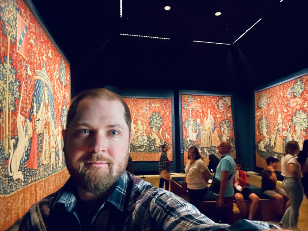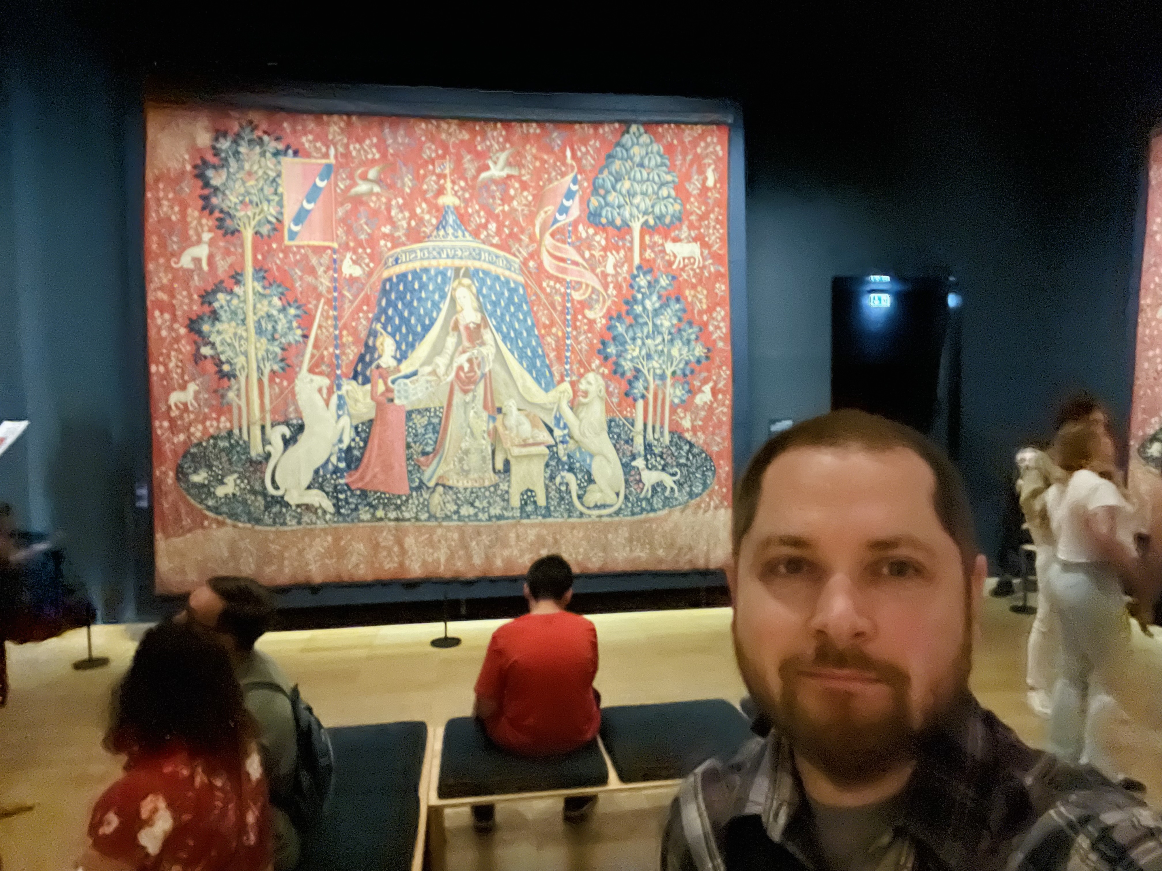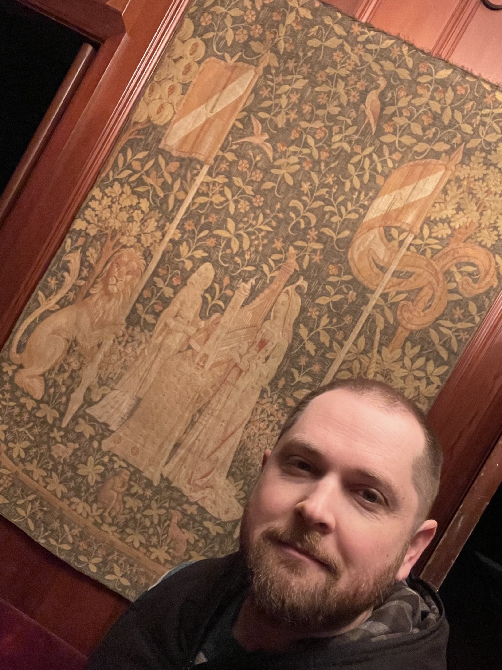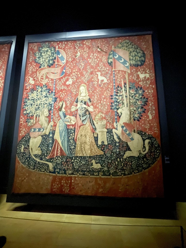 The Book of Glory, from the beginning, invites us to engage with our sense of touch, but it also invites to engage with a sixth sense. As I was studying the Gospel of John and the five senses these last few months, I learned about a series of six medieval tapestries which are considered one of the most powerful evocations of the five senses. They are called “The Lady and the Unicorn” and they have been hailed as “the Mona Lisa of the Middle Ages.” Each one of these tapestries portrays a Lady and a Unicorn engaging with one of the five senses; and as I looked at them online, I quickly realized that we have one of them hanging in our narthex! Our tapestry here represents our sense of hearing as the Lady plays a portative organ while her maidservant operates the billows and while the unicorn and other happy creatures enjoy listening to the music. (The inclusion of the organ in the tapestry is apt, considering the prominence of our custom designed Kegg Pipe Organ.)
