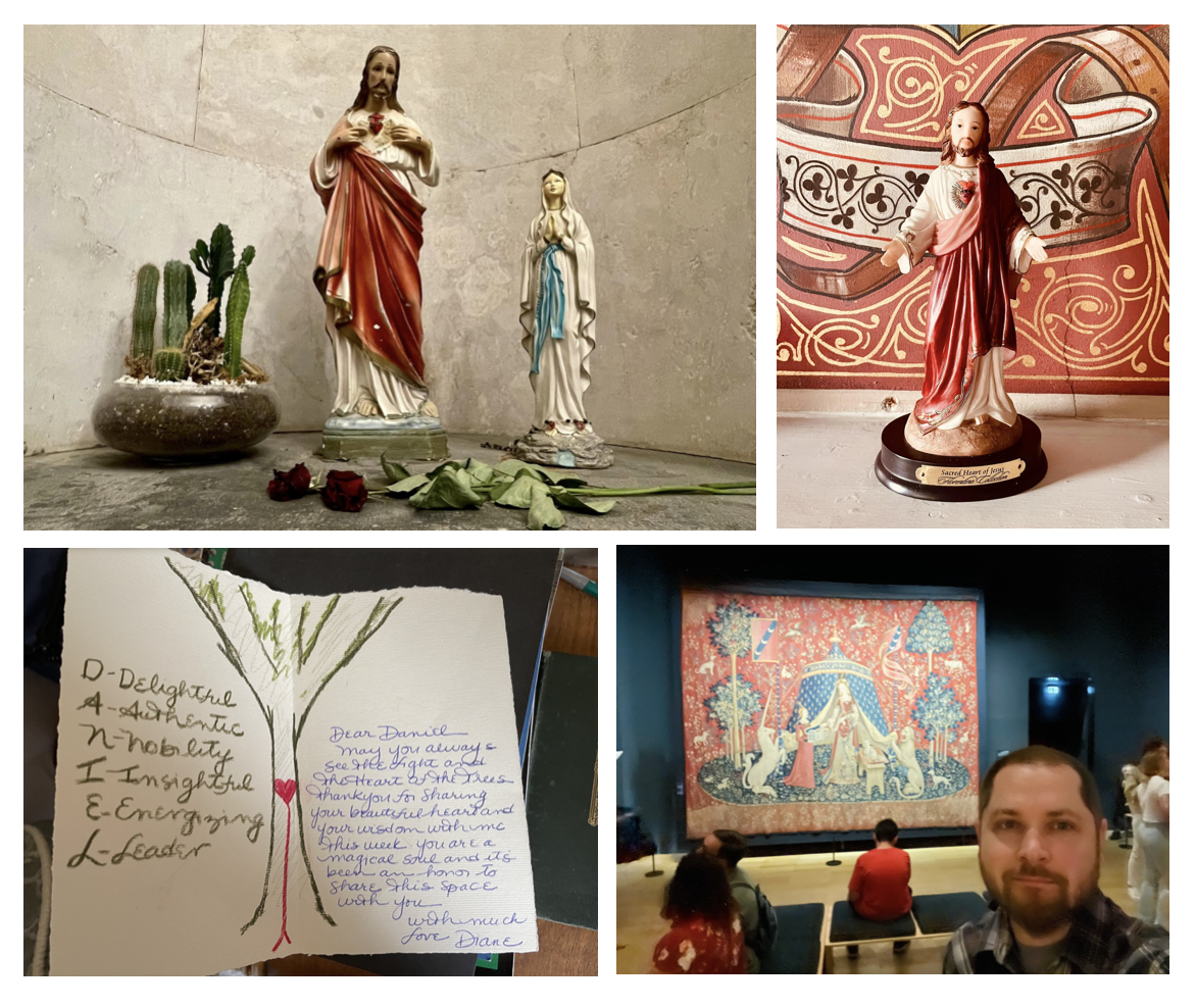 This invitation to get more in touch with the heart sense was a theme that kept emerging throughout my Sabbatical. During my Forest Therapy Guide Training in England, we talked about listening to the heart of trees. Statues of the Most Sacred Heart of Jesus kept showing up, especially throughout Italy. And I got to visit one of the most creative medieval portrayals of the heart sense at the Cluny Museum in Paris, which houses the six tapestries of The Lady and The Unicorn (La Dame et la Licorne). Five of the tapestries portray each of the five bodily senses (we have a copy of the hearing sense tapestry in our narthex) while the sixth tapestry portrays the sixth sense, which is the heart (A mon seul désir).