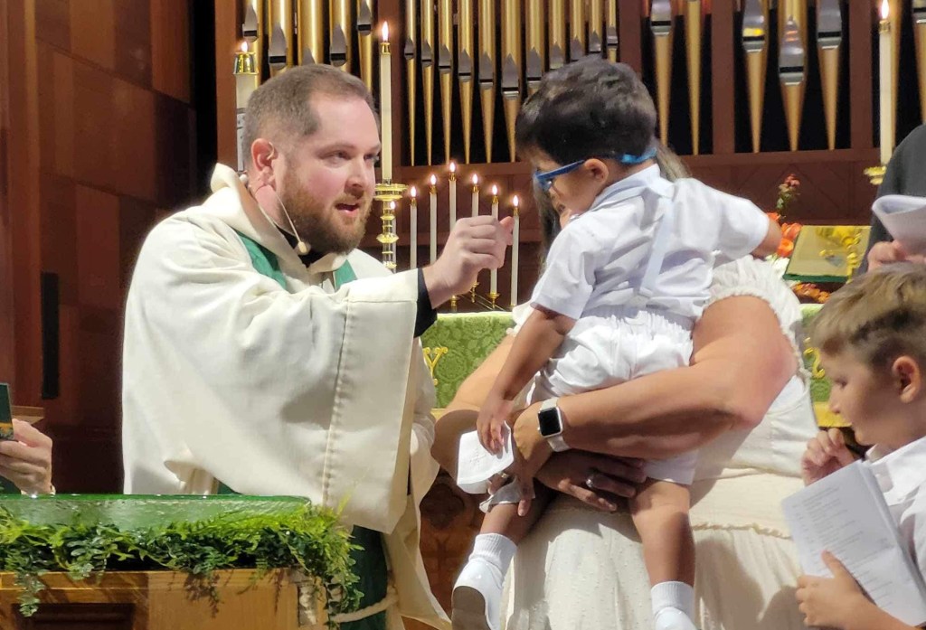 Last Sunday, I invited you all to ask yourself, “What is one thing that spoke to you from the service? What word or phrase or image plucked the strings of your heart?” I invite you to continue asking yourself this question every Sunday after worship and I encourage you to share that one thing with others. After the 10:30 service last Sunday, I was speaking with a young mother and her child in Lewis Hall and another parishioner approached us and shared the one thing that spoke to him in the service, which he had written down on a piece of paper. For him, the one thing that stood out was “The cry of a small baby—the life of the church—the new life that epitomizes the growth of my church. Any mild annoyance at the brief interruption is far overshadowed by the glory of the new life in our congregation.” The mother and I were both deeply moved by these words and I’m ever grateful for the parishioner who shared them with us. His words echo the message of today’s Gospel in which Jesus takes a little child in his arms and says to his disciples, “Whoever welcomes one such child in my name welcomes me, and whoever welcomes me welcomes not me [also] but the one who sent me.” It’s hard to imagine a better Gospel for us today when we welcome Mason Christopher Bozzoli into the Body of Christ through the sacrament of holy baptism; Mason, whose middle name “Christopher” means “Christ bearer.” By welcoming Mason, we are welcoming Christ into our midst. It’s also hard to imagine a better Gospel for us today because today is the week before we resume our Joy Mass family service at 9:30 AM in the chapel, a service open to children of all ages from 2 to 42 to 102. The Gospel today is inviting you all to Joy Mass where you can welcome a child and welcome the child within you and thus welcome Christ. This invitation to Joy Mass is for everybody except perhaps the choir members who usually have rehearsal at the same time, so this is the one day I cannot be accused of “preaching to the choir.” However, I certainly appreciate some of the choir members who have participated in Joy Mass as storytellers and helpers on occasion.