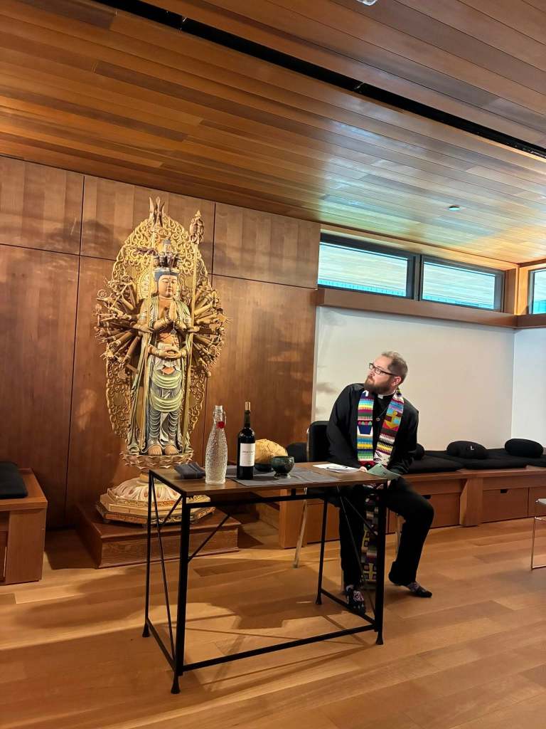 Although we all love it when the Word becomes flesh here in this magnificent sanctuary, the church (the Body of Christ) is not chained to this building. The Word becomes flesh whenever we sing the doxology and celebrate Eucharist in the redwoods during our Sacred Saunters. The Body of Christ is made manifest whenever we gather for intimate Eucharists at people’s homes just as the Associates of the Transfiguration did this last Friday; and the Word of God became flesh in a Zendo, a Zen Buddhist meditation hall in Healdsburg for the first time this last Thursday, as I celebrated Eucharist with several residents of the Ensō Village community, including several Episcopalians. We sang the doxology with a loud voice (a phones megales) with a wooden statue of the Bodhisattva of Compassion standing behind us. While I will admit that my inner Brother Elias questioned the appropriateness of celebrating Eucharist in a Zendo, I also felt the Spirit of Christ urging me to believe that God was doing a new thing; and that the Word of God is indeed unchained. I learned that, according to legend, the Bodhisattva of Compassion made a vow to alleviate the suffering of all sentient beings and to never fall into despair; and that one of the most trusted ways that the Bodhisattva avoids falling into despair is by practicing gratitude and encouraging others to do so as well, to euchariston, which is exactly what we were doing. So, may we emulate the healed Samaritan, the singing St. Francis, and the Bodhisattva of Compassion by glorifying God with a phones megales and expressing gratitude to God with generous hearts in the Eucharist! Amen.