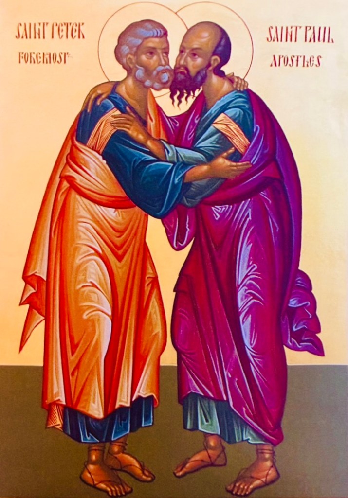 While reflecting on these two saints who are known as the Holy Foremost Apostles, I was reminded of the writings of a French philosopher named René Girard, who wrote about the poignant question that connects them both. After Peter denied Jesus three times following his arrest, the Gospel of Luke says that Jesus turned and looked at Peter, who then wept bitterly (Luke 22:62). According to Girard, this look pierces Peter’s heart because Peter reads in the look the following question: “Why do you persecute me?” This is the same question that Paul hears from Jesus’ mouth when he travels to Damascus to violently detain Jewish followers of Jesus, a question that knocks Paul to the ground (Acts 9:4).