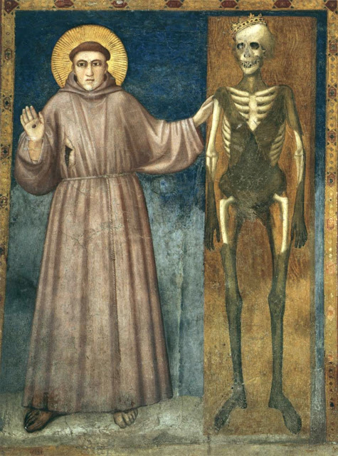 These words, along with the fresco, offer one of the most helpful Christian perspectives on death. In the fresco, Francis has his left hand placed on the shoulder of the skeleton as if befriending Death as a fellow sibling. The friar pointed out to me the crown upon the skull of Death is sliding off because Death no longer reigns supreme, Death has lost its sting, thanks to Christ’s victory on the Cross. Since Death has been defeated, Francis can see Death as indeed a fellow sibling through whom God receives praise: “Praised be You, my Lord, through our Sister Bodily Death from whom no one living can escape.” Death becomes an unavoidable, inevitable, inescapable gateway into greater life. We need no longer fear death. We can even befriend death when it comes, but we certainly do not seek death, lest we die in mortal sin: Woe to those who die in mortal sin, but blessed are those whom death will find – and death will find us all – blessed are those whom death will find in Your most holy will, because for them, for us, death is a gateway to greater life.