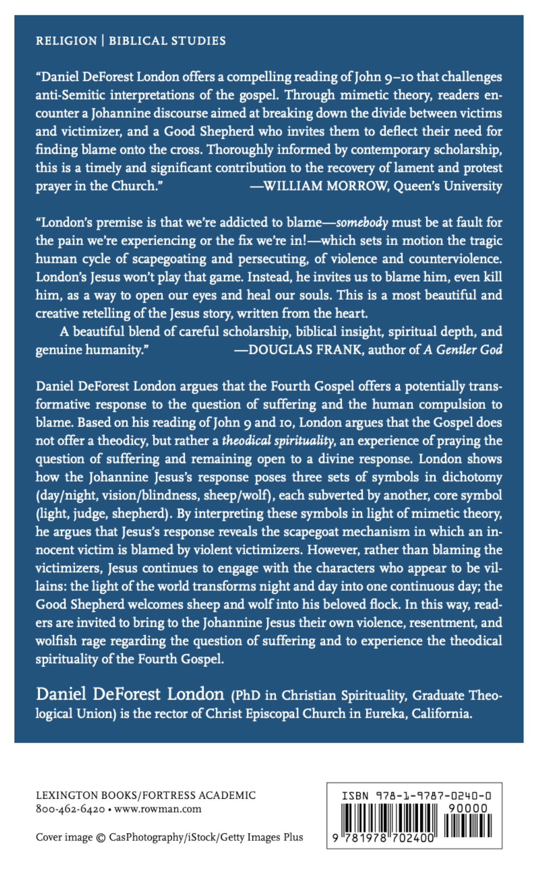 In this readable and pioneering book, Daniel DeForest London offers a transformative reading of John 9 and 10. Employing the “Anthropological tale” of René Girard as an interpretive key to this section of John (i.e. the human propensity toward blaming and scapegoating) London shows how the Johannine Jesus transforms both victim and victimizer. The theodical spirituality emerging from his exegesis offers the promise of liberation and new life to the reader, the church and the world. This is the most important theological book I have read in the last twenty years!