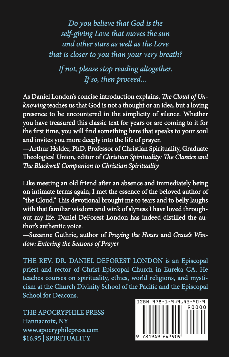 “Like meeting an old friend after an absence and immediately being on intimate terms again, I met the essence of the beloved author of “the Cloud.” This devotional brought me to tears and to belly laughs with that familiar wisdom and wink of slyness I have loved throughout my life. Daniel DeForest London has indeed distilled the author’s authentic voice.”